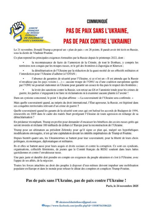 Le plan de Poutine relayé par Trump : communiqué du RESU. Pas de paix sans l’Ukraine ! Pas de paix contre l’Ukraine !
