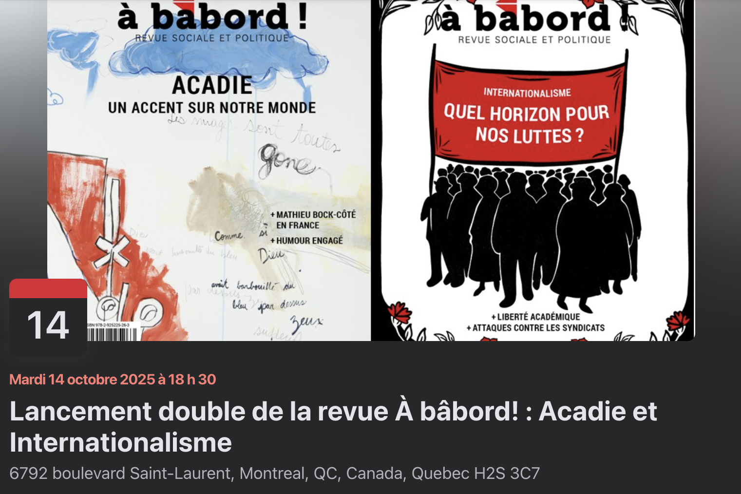 La parution du numéro 104 (et son dossier sur l'Acadie) et du numéro 105 (et son dossier sur l'internationalisme) seront soulignés à la librairie N'était-ce pas l'été (6702 St-Laurent, Montréal).