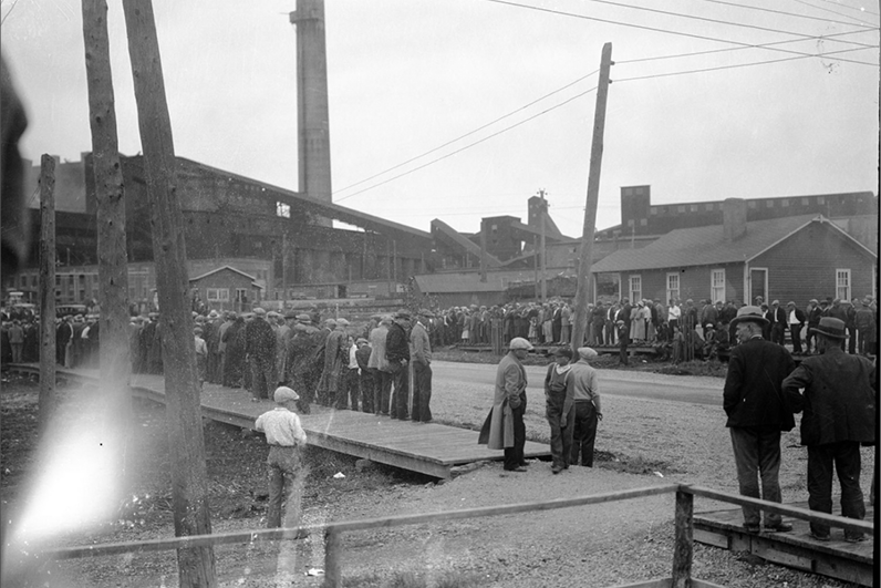 Photo : Grévistes devant la Fonderie Horne, 1934 (Bibliothèque et Archives Nationales du Québec).