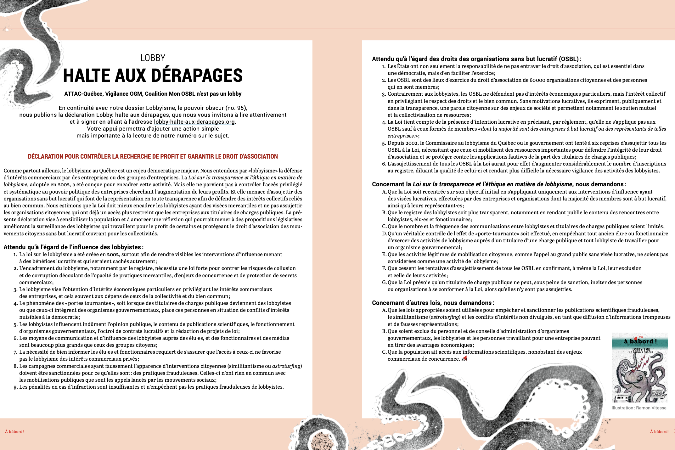 En continuité avec notre dossier Lobbyisme, le pouvoir obscur (no. 95), nous publions la déclaration Lobby : halte aux dérapages, que nous vous invitons à lire attentivement et à signer en allant à l'adresse https://lobby-halte-aux-derapages.org. Votre appui permettra d'ajouter une action simple mais importante à la lecture de notre numéro sur le sujet.