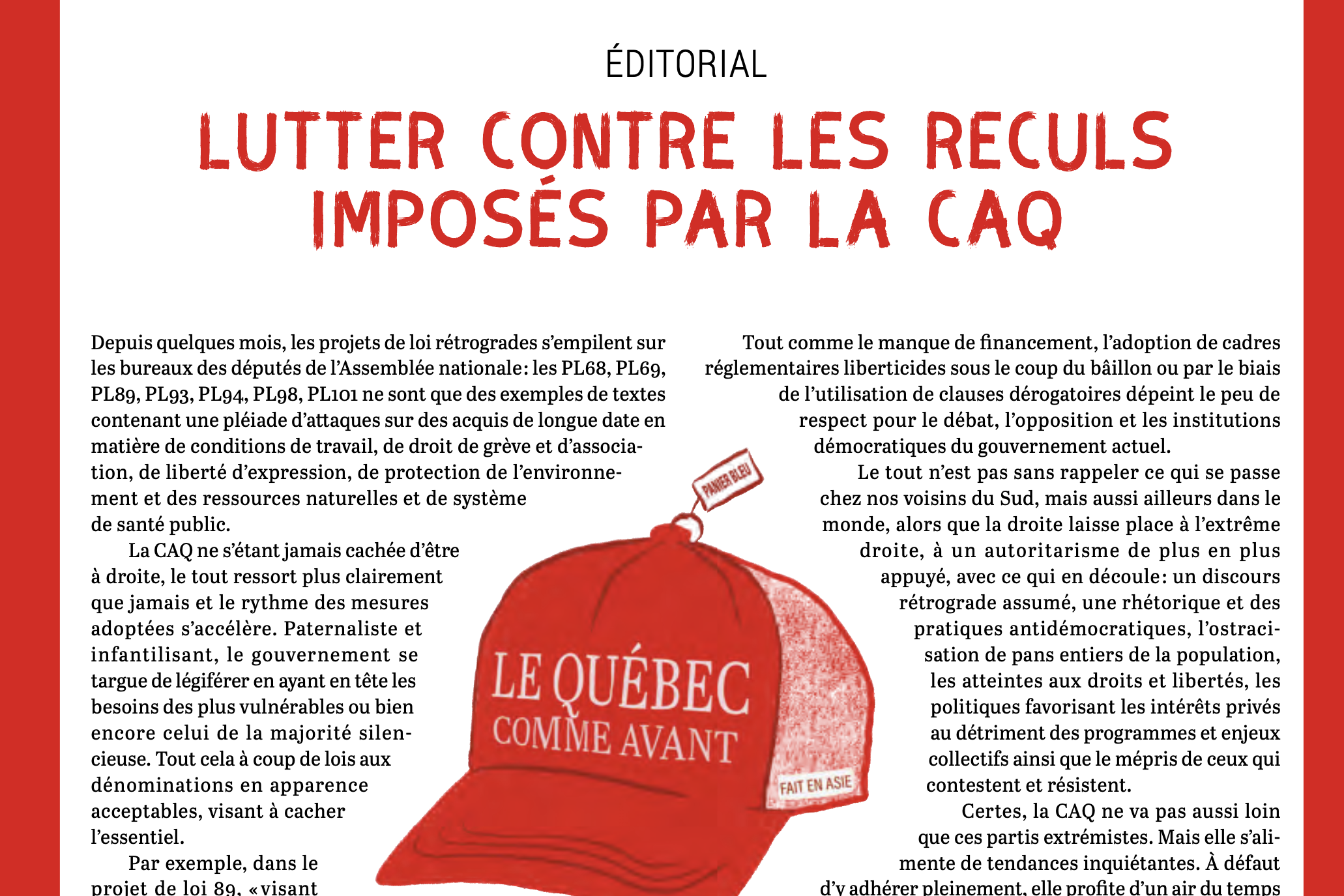 Certes, la CAQ ne va pas aussi loin que ces partis extrémistes. Mais elle s'alimente de tendances inquiétantes. À défaut d'y adhérer pleinement, elle profite d'un air du temps réactionnaire. Plusieurs des éléments normatifs mis de l'avant par ce parti constituent bel et bien une offensive sur des gains durement acquis. Ne nous méprenons pas : la CAQ sent la fin de son règne et tente d'abattre le plus de travail possible pour démanteler des droits et avantages arrachés au prix de luttes laborieuses. Ne nous laissons pas submerger par la quantité abondante de la réglementation qui déferle, mais organisons-nous, dénonçons les pratiques antidémocratiques au service du secteur privé, du patronat et d'intérêts réduits. Démontrons, au sein de nos organisations, toute la solidarité dont nous sommes capables. Nous n'avons ni la place ni le temps pour l'apathie !