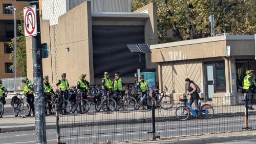 Deux rangées de policiers, une ambulance, possiblement des caméras à reconnaissance faciale : pour une simple trentaine de cyclistes, le dispositif frisait l'absurde. Mais il disait quelque chose : protester contre l'industrie pétrolière dérange — même pacifiquement, même à vélo.