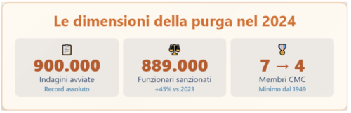 Les chiffres témoignent d'une purge qui a peu de précédents dans l'ère post-maoïste. En 2024, la Commission centrale d'inspection disciplinaire a ouvert près de 900 000 enquêtes, un record absolu, tandis que les sanctions administratives ont touché 889 000 fonctionnaires, soit une augmentation de 45 % par rapport à l'année précédente. La tempête a également touché les dirigeants de l'APL (Armée populaire de libération), la Commission militaire centrale, organe suprême de commandement des forces armées présidé par Xi Jinping, passant de sept à quatre membres, la configuration la plus restreinte depuis la fondation de la République populaire en 1949. La contraction n'est pas seulement numérique et la nouvelle composition révèle un déséquilibre structurel sans précédent, puisque la marine, l'armée de l'air et les forces créées après les réformes de 2016 ne sont plus représentées au sein de la Commission. Seuls l'armée de terre et les unités de missiles balistiques également compétentes en matière nucléaire, restent représentées. Il convient de noter que l'armée a, entre autres, pour mission de « gérer » les éventuelles manifestations internes impliquant plus de cinq mille personnes.