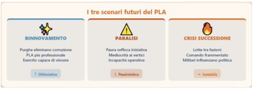 Les scénarios possibles pour l'avenir de la PLA s'articulent autour d'un éventail diversifié d'hypothèses, dont aucune n'est sans risque. Le premier scénario, le plus optimiste du point de vue de Pékin, verrait les purges éliminer efficacement la corruption et les réseaux clientélistes et, après une phase de transition douloureuse, émerger une armée plus professionnelle et plus efficace. Dans ce scénario, les sacrifices actuels seraient le prix à payer pour construire une PLA véritablement capable de « combattre et gagner des guerres », selon le slogan constamment répété par Xi. Mais des doutes subsistent quant à la faisabilité d'un tel scénario. Éliminer les individus corrompus ne résout pas les problèmes systémiques. Sans réformes structurelles pour introduire la transparence et des mécanismes de contrôle mutuel entre les institutions, le problème de la corruption réapparaîtra inévitablement. Dans un système où le pouvoir est concentré et opaque, et où les promotions dépendent d'évaluations subjectives de la « fiabilité politique » plutôt que de mesures objectives de compétence, les opportunités et les incitations à des comportements corrompus restent intactes.