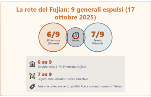 Les liens qui existent entre les officiers purgés permettent de voir que derrière la rhétorique officielle de la lutte contre la corruption se cache un réseau de relations qui traversait les centres névralgiques du commandement militaire. Sur les neuf généraux expulsés du Parti et des forces armées le 17 octobre dernier, six avaient servi dans la 31e armée de groupe, rebaptisée 73e, une unité d'élite stationnée à Xiamen, dans la province du Fujian. Cette même province où Xi Jinping a travaillé comme fonctionnaire local dans les années 80 et 90, construisant ce que les analystes et les observateurs ont appelé la « clique du Fujian », un réseau de loyautés personnelles sur lequel le leader chinois a fondé une partie de son pouvoir. Sept des neuf généraux destitués avaient également des liens avec le Commandement du théâtre oriental, responsable des opérations vers Taïwan. Il ne s'agit donc pas d'épisodes isolés, mais d'un complot qui reliait les dirigeants politiques de l'armée aux commandements opérationnels les plus sensibles pour la stratégie de Pékin dans le détroit.