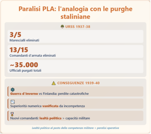 Le deuxième scénario, le plus défavorable au régime, est celui d'une paralysie prolongée, dans laquelle la peur et les contrôles étouffants alimenteraient une culture de prudence extrême qui traverserait toute la structure militaire. À tous les niveaux, les officiers éviteraient de prendre des responsabilités, préférant se cacher derrière la bureaucratie plutôt que de prendre des décisions autonomes. Dans ce climat, l'APL perdrait sa capacité d'initiative tactique et d'adaptation rapide, indispensables dans la guerre moderne, tandis que les postes clés resteraient vacants ou seraient confiés à des personnalités médiocres, politiquement fiables mais dépourvues des qualités nécessaires pour exercer un véritable commandement. L'analogie historique la plus pertinente est celle des purges staliniennes de l'Armée rouge entre 1937 et 1938, lorsque trois maréchaux sur cinq, treize commandants d'armée sur quinze et environ 35 000 officiers au total ont été éliminés. Les conséquences en ont été désastreuses. Lors de la guerre d'hiver contre la Finlande en 1939-1940, l'Armée rouge, malgré sa supériorité numérique écrasante, a subi des pertes catastrophiques contre une armée finlandaise beaucoup plus petite, en raison de l'incompétence des nouveaux commandants promus pour leur loyauté politique plutôt que pour leurs capacités militaires.