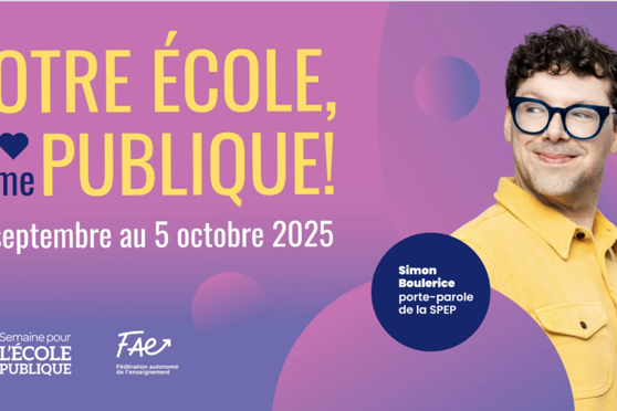 Cette année, comme chaque automne, la Semaine pour l'école publique (SPEP) revient, dans une formule améliorée ! Du 29 septembre au 5 octobre, ce sera l'occasion pour la FAE, mais aussi pour toutes les personnes travaillant au sein des écoles publiques du Québec, pour les élèves et leurs parents ainsi que pour toutes celles et tous ceux qui l'ont à cœur comme notre porte-parole, l'auteur Simon Boulerice, de souligner leur attachement à cette institution, d'en faire la promotion et surtout de mettre en valeur son importance cruciale pour la société québécoise.