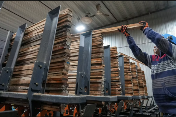 Tiré de The conversation. Photo : Des travailleurs empilent et trient le bois d'œuvre résineux fraîchement coupé dans une usine de sciage à Mont-Blanc, au Québec. Le projet de loi 97 a été vivement critiqué par des communautés autochtones et des groupes environnementaux. La Presse Canadienne/Christinne Muschi