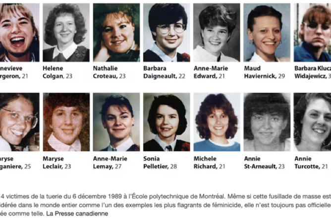 Cela fait 36 ans que le massacre de 14 jeunes femmes a eu lieu à l'École Polytechnique de Montréal. Un homme les a abattues parce qu'elles étaient des femmes. Qualifié d'acte « violent de misogynie » par le gouvernement fédéral, ce massacre n'a pourtant jamais été officiellement qualifié de féminicide au Canada, malgré sa reconnaissance mondiale. Des femmes et des filles continuent d'être tuées tous les deux jours au pays, très majoritairement par des hommes. Et les chiffres continuent d'augmenter.