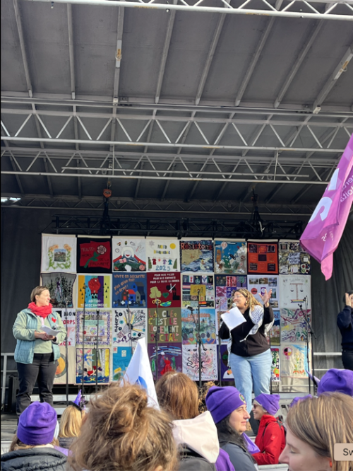 Quelle émotion de voir notre morceau de courtepointe intégré à l'œuvre collective de la Marche symbolisant la vibrante solidarité entre les femmes de toutes les régions du Québec ! Dans les chants, les rires, les pas et les pancartes, c'est toute une mémoire de luttes qui a vibré à l'unisson.