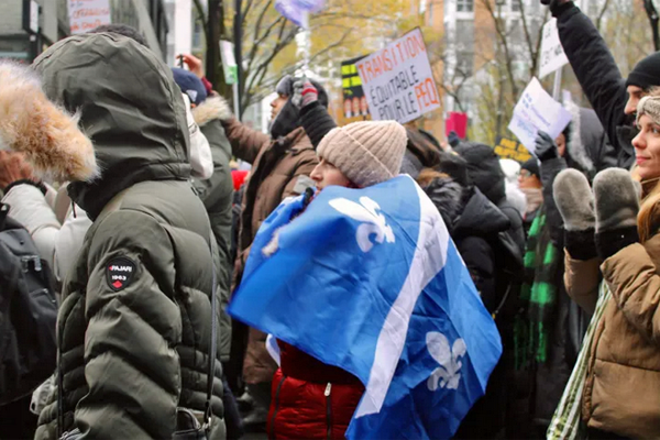 19 novembre 2025 | tiré du journal des Alternatives | Photo : Des manifestants défilent sur le boulevard Saint Laurent contre la suppression du PEQ - Charline Caro